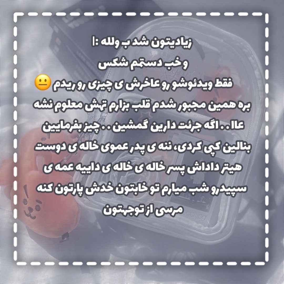 چرا انقد ترسناکه؟ همیشه ازش میترسیدم. شاید بره همینه که همش برام اتفاق میوفته نه؟ از اول حتی فک کردن بش حالمو بد میکرد. آینده!؟ یه ساعت دیگه سه ساعت دیگه یه روز دیگه یه ماه دیگه یه سال دیگه . . ترسناک نیست؟ اگه بهم دوسال پیش میگفتن قراره دو سال بتمرگی خونه، دو ماه پیش میگفتن خالت میاد خونتون به دوستات، همکلاسیات حتی معلمات . . ودف؟ پیم میده / زنگ می زنه میگه یه بار دیگه مزاحم شین ازتون شکایت میکنم، باور میکردم؟ مسلما نه. وقتی باور داشته باشی زندگیت فاکیه خیلی از اینده میترسی. میدونم 99.999999999 درصدتون اصلا پستو نمیخونین.. ولی دارم ب این امید این پستو مینویسم ک اون 0.000000001 درصدی که میخونن بم بگن. چرا؟ چرا اینطوریه؟ یا همه چی برات معمولیه یا همه چی باهم برات میرینه. و دقیقا وقتی پونصد و دو تا اتفاق شخمی باهم برات میوفتن..همه ی کسایی که میتونن با حرفاشون بت ارامش بدن نیستن و این خیلی ترسناک تر از آیندست.گرچه اینکه نمیتونی هیچیو کنترل کنی از همشون ترسناک تره، هیچی..حتی افکار خدتو که از همه چی بیشتر میرینن بت. نمیدونم فازم چیه و اصلا چی دارم میگم..فقط خیلی دلم میخاد ی نفررر حداقلل یه نفر بود ک بم میگف درس میشه جر . . میدونین چی فاکی ترش میکنه؟ اینکه کسایی که اصلا از هیچی خبر ندارن و نمیتونن درکت کننو فقط میخان ی چیزی گفته باشن بیان نصیحتت کنن نه؟